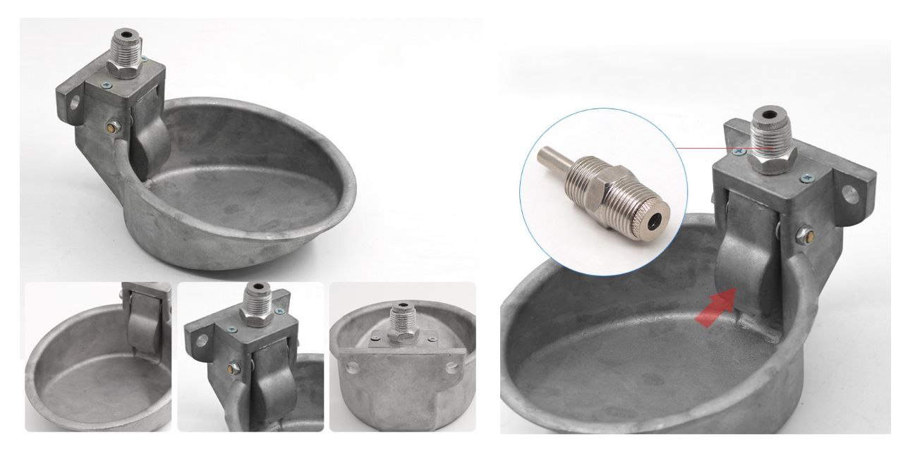 Зручна алюмінієва чашкова поїлка для свиней і поросят з кріпленням на трубу або клітку. Краї миски заокруглені - запобігаючи тварин від поранення. Вода підводиться за допомогою труби, з'єднання з трубою - різьблення на 1/2» Надійна. Чашкова поїлка для свиней встановлюється до стіни або клітки з переходом на опуск і через шланг до водопроводу. Залежно від віку свиней і виду поїлок, їх встановлюють на потрібній висоті для зручності користування, є можливість дозовано вводити ліки і вітаміни. Поїлка дає змогу запобігти зайвому потраплянню води на підстилку, намоканню її та загниванню. Завдяки чому Ви отримуєте максимально чисту і здорову атмосферу в клітках. Поїлка влаштована таким чином, щоб забезпечувати легкий доступ до води.