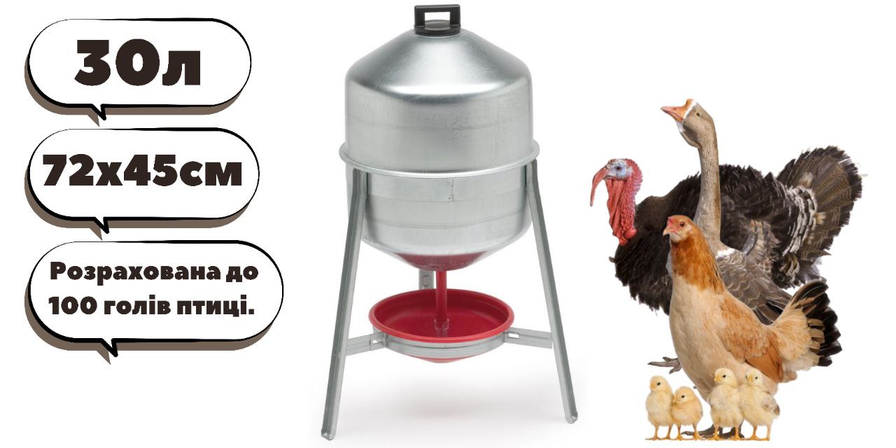 Призначена: для напування будь-яких видів свійських птахів. Встановлюється як в приміщенні так і на вулицю. Поїлка дуже стійка завдяки тринозі. Розрахована на 100 кур. Всі металеві частини зроблені з якісної італійської оцинкованої сталі. Підходить для курей, несучок, індиків, качок, гусей.