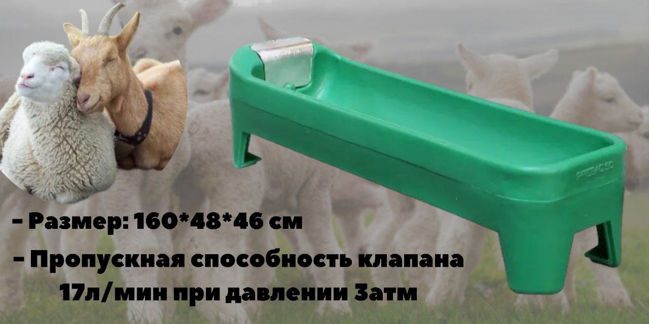 Зручна пластикова групова поїлка для овець і кіз прискорює процес пиття води тваринами, автоматизує догляд за живністю та полегшує працю працівників. Вода підводиться за допомогою труби, з'єднання з трубою - різьблення на 1/2". Групова поїлка для сільськогосподарських тварин встановлюється в будь-якому зручному місці чи то клітки, чи то пасовища. Поїлка дає змогу напоїти до 50 голів худоби, що істотно полегшує догляд і утримання тварин. Завдяки чому Ви отримуєте максимально чисту і здорову атмосферу в стаді. Поїлка влаштована таким чином, щоб забезпечувати легкий доступ до води. Загальна ємність води 90л, Зливна пробка, добре захищений поплавковий клапан Гарантія 8 років Матеріал - високоякісний поліетилен. Ширина поїлки 48 см, довжина 160 см, висота 46 см. Пропускна здатність клапана 17літрів/хвилину при тиску 3 атм.