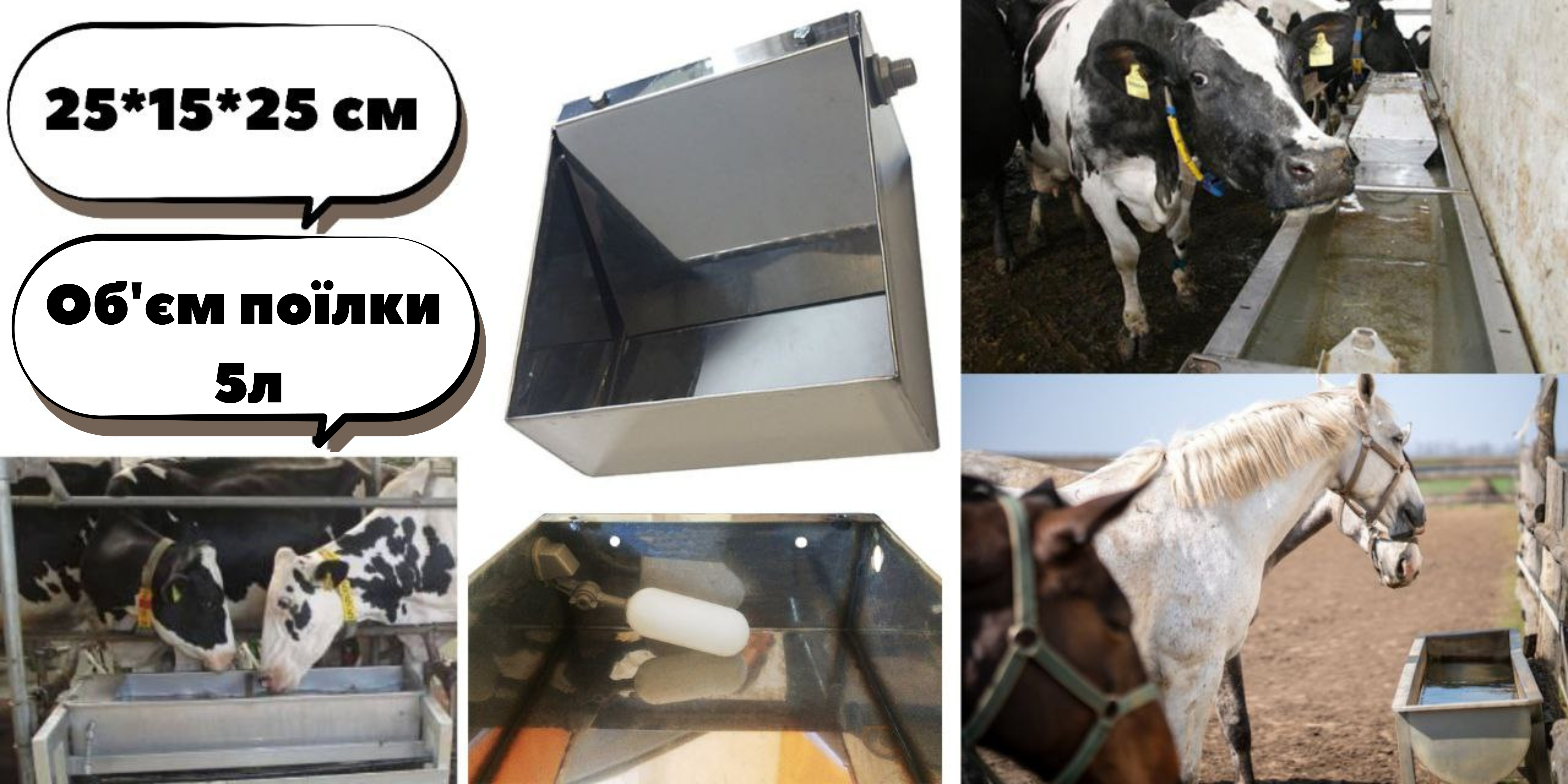 Зручна групова поїлка для великої рогатої худоби. Вода підводиться за допомогою труби, з'єднання з трубою - різьблення на 1/2". Дана поїлка прискорює процес пиття води тваринами, автоматизує догляд за живністю та полегшує працю працівників. Миска для води з плаваючою кулею може підтримувати певний рівень води, тож поголів'я питної води більш рясне, більш комфортне. Поїлка з язичком - вода набирається в поїлку під час натискання, використовується як індивідуальна поїлка для худоби.Поїлка влаштована таким чином, щоб забезпечувати легкий доступ до води. Загальна ємність води 230-260л. Ширина поїлки 25 см, висота 15 см, довжина 25 см.