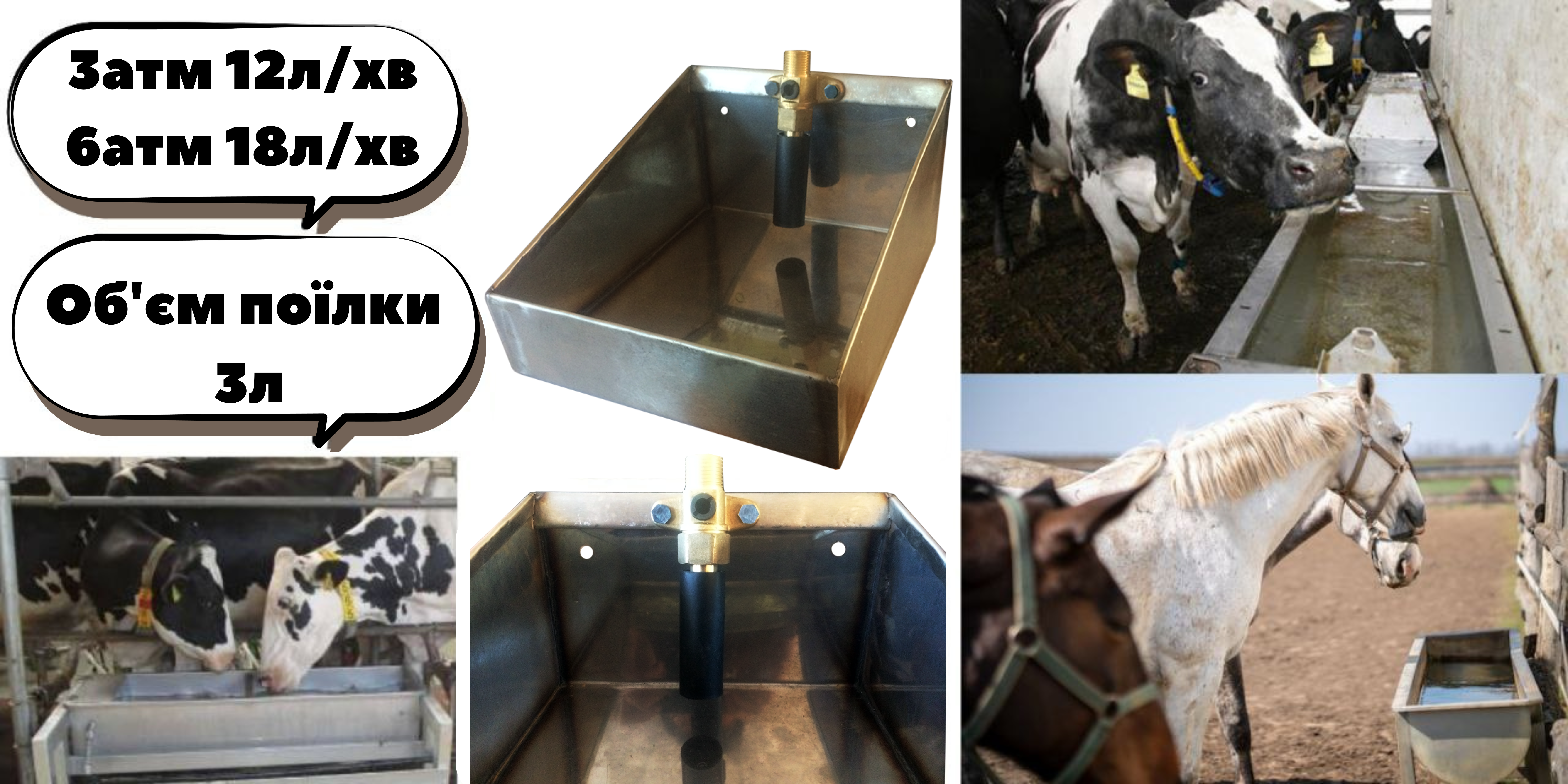 Зручна групова поїлка для великої рогатої худоби. Вода підводиться за допомогою труби, з'єднання з трубою - різьблення на 1/2". Дана поїлка прискорює процес пиття води тваринами, автоматизує догляд за живністю та полегшує працю працівників. Пропускна здатність поїлки за 6 атмосфер 18 літрів/хвилину, за 3 атмосфер 12 літрів/хвилину. Використовується як індивідуальна поїлка для худоби.Поїлка влаштована таким чином, щоб забезпечувати легкий доступ до води. Об'єм чаші 3 літри.